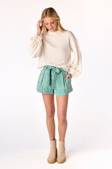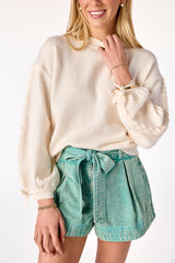 Introducing the luxurious Bennie Braided Sweater, crafted from a soft and cozy knit. This exquisite sweater showcases meticulously hand-braided knit detailing and a charming knit bow at the sleeve opening. With its elegant drop shoulder silhouette, this sweater is the perfect complement to our tencel skirts and denim shorts, see how to style this cute sweater. Kennedy wears the Bennie with the Emmerson Mini Skirt. Ashlynn Pairs the Bennie Sweater with the Tupelo Denim Shorts.